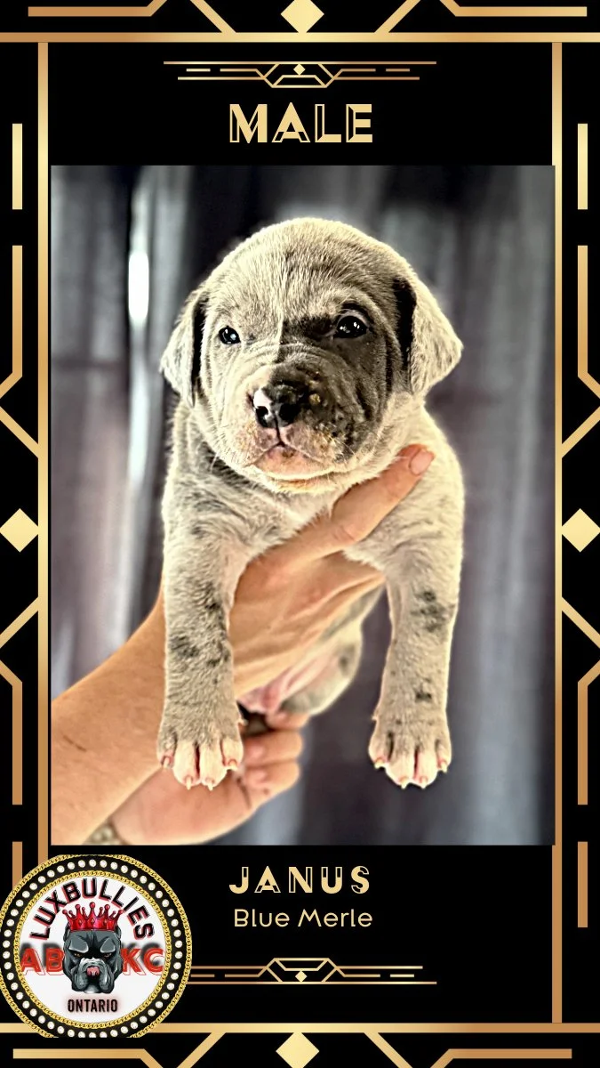 LuxBullies JANUS "JJ" ˗ˋˏ 𖢻 ˎˊ˗ LuxBullies JANUS "JJ" ˗ˋˏ 𖢻 ˎˊ˗ LuxBullies JANUS "JJ" ˗ˋˏ 𖢻 ˎˊ˗ Sex: MaleColour: Blue-Tri MerleDOB: May 5, 2024ABKC Registered ✓